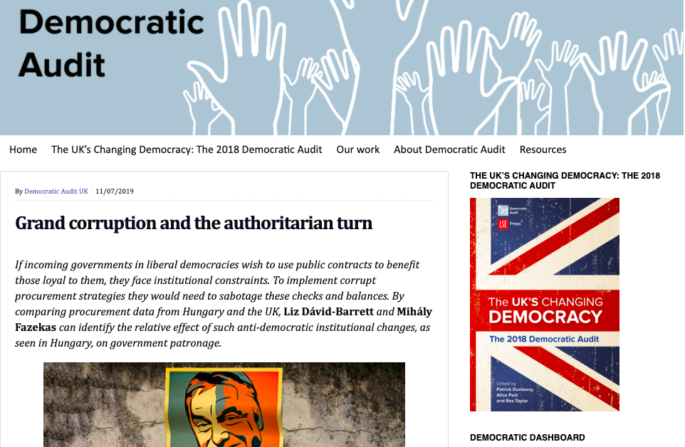 If incoming governments in liberal democracies wish to use public contracts to benefit those loyal to them, they face institutional constraints. To implement corrupt procurement strategies they would need to sabotage these checks and balances. By comparing procurement data from Hungary and the UK, Liz Dávid-Barrett and Mihály Fazekas can identify the relative effect of such anti-democratic institutional changes, as seen in Hungary, on government patronage.
