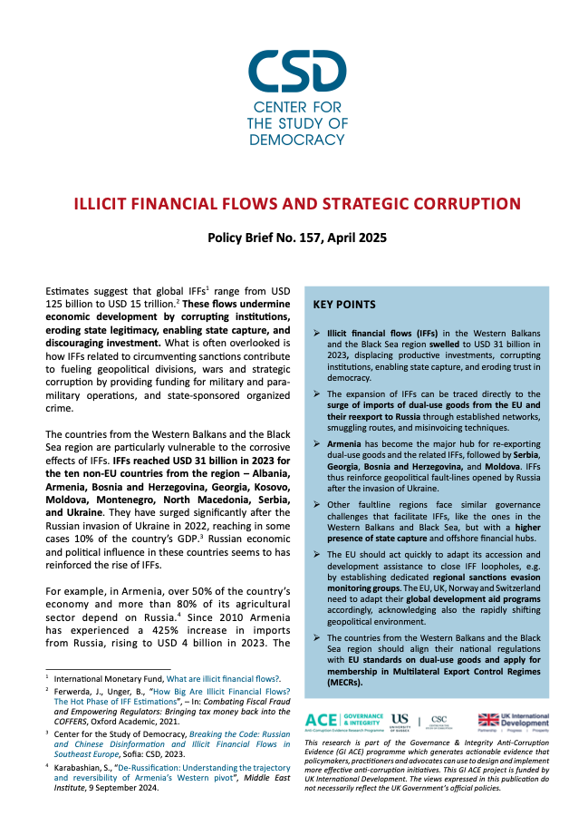 The research proposal aims to build upon the Center for the Study of Democracy’s considerable practical anti-corruption experience in EU candidate countries, the Western Balkans, Armenia, Georgia, Moldova, and Ukraine. It zooms in and deciphers how to most effectively develop evidence-based policies, institutions, tools and instruments to tackle state capture and strategic corruption. The project will map the evidence of the elements of the state capture toolbox that local and foreign (Russian) oligarchic networks and enablers have deployed for exercising corruptive influence in these countries. The research and policy action will focus on the most powerful weapon and driver of strategic corruption and state capture: illicit financial flows (IFFs). This exercise will outline a clear, practical pathway for curbing strategic corruption and countering state capture risks in ODA-eligible countries through measuring and monitoring IFFs and providing relevant public institutions with the necessary anti-corruption instruments and know-how.