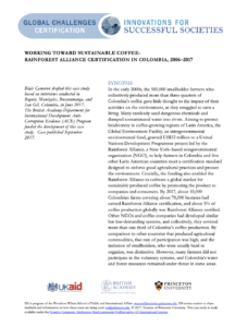In the early 2000s, the 500,000 smallholder farmers who collectively produced more than three-quarters of Colombia’s coffee gave little thought to the impact of their activities on the environment, as they struggled to earn a living. Many carelessly used dangerous chemicals and dumped contaminated water into rivers. Aiming to protect biodiversity in coffee-growing regions of Latin America, the Global Environment Facility, an intergovernmental environmental fund, granted US$12 million to a United Nations Development Programme project led by the Rainforest Alliance, a New York–based nongovernmental organization (NGO), to help farmers in Colombia and five other Latin American countries meet a certification standard designed to enforce good agricultural practices and protect the environment. Crucially, the funding also enabled the Rainforest Alliance to cultivate a global market for sustainably produced coffee by promoting the product to companies and consumers. By 2017, about 10,000 Colombian farms covering about 70,000 hectares had earned Rainforest Alliance certification, and about 5% of coffee production globally was Rainforest Alliance certified. Other NGOs and coffee companies had developed similar but less-demanding systems, and collectively, they covered more than one third of Colombia’s coffee production. By comparison to other countries that produced agricultural commodities, that rate of participation was high, and the inclusion of smallholders, who were usually hard to organize, was distinctive. However, many farmers did not participate in the voluntary systems, and Colombia’s water and forest resources remained under threat in some areas.