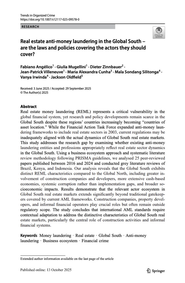 Real estate money laundering (REML) represents a critical vulnerability in the global financial system, yet research and policy developments remain scarce in the Global South despite these regions’ countries increasingly becoming “countries of asset location.” While the Financial Action Task Force expanded anti-money laundering frameworks to include real estate sectors in 2003, current regulations may be inadequately aligned with the actual dynamics of Global South real estate markets. This study addresses the research gap by examining whether existing anti-money laundering entities and professions appropriately reflect real estate sector dynamics in the Global South. Using a business ecosystem approach and systematic literature review methodology following PRISMA guidelines, we analysed 25 peer-reviewed papers published between 2016 and 2024 and conducted grey literature reviews of Brazil, Kenya, and Indonesia. Our analysis reveals that the Global South exhibits distinct REML characteristics compared to the Global North, including greater involvement of construction companies and developers, more extensive cash-based economies, systemic corruption rather than implementation gaps, and broader socioeconomic impacts. Results demonstrate that the relevant actor ecosystem in Global South real estate markets extends significantly beyond traditional gatekeepers covered by current AML frameworks. Construction companies, property developers, and informal financial operators play crucial roles but often remain outside regulatory scope. The study concludes that international AML standards require contextual adaptation to address the distinctive characteristics of Global South real estate markets, particularly the central role of construction activities and informal financial systems.
